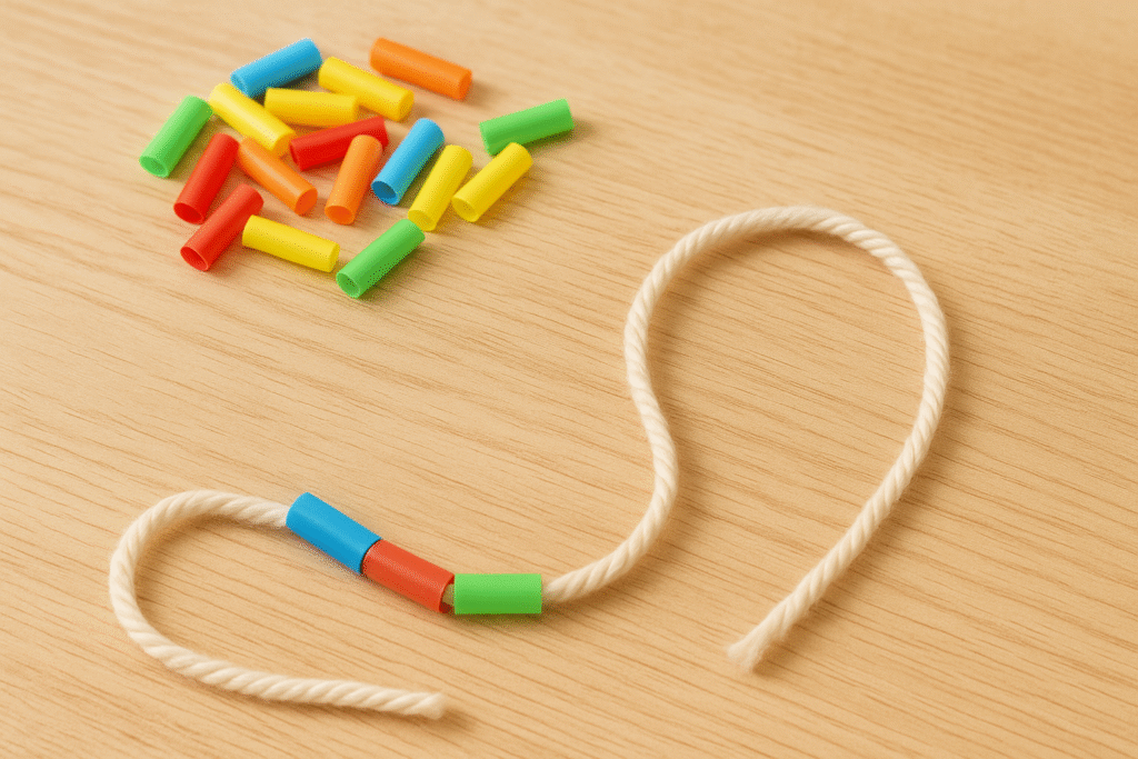 | 3歳ごろ | 通す動きの安定、左右の手の協応 | ストロー・大きめビーズ程度 |